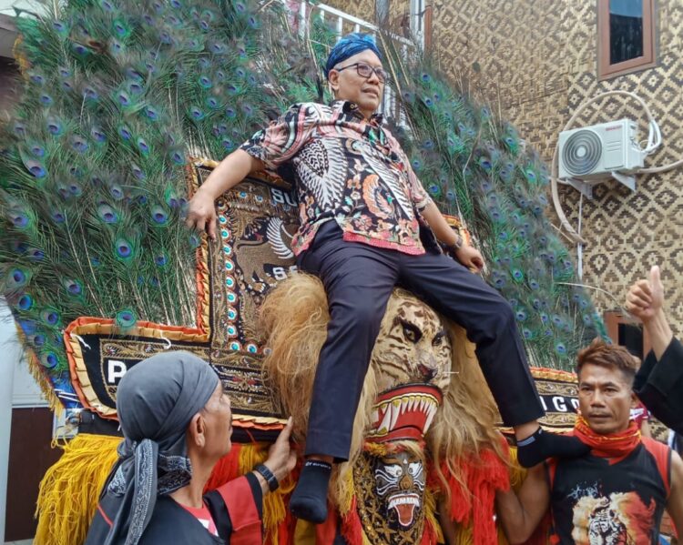 Anggota Komisi VI DPR RI Fraksi PDI Perjuangan, Ananta Wahana disunggul Reog Ponorogo saat pelaksanaan pesta seni budaya di Padepokan Sosial Budaya Mbagun Karso, Kelapa Dua, Kabupaten Tangerang/Foto: Dok Semartara.