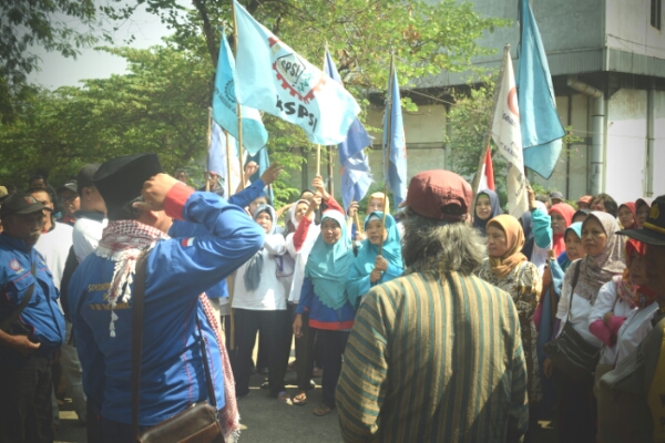 SEMARTARA – 301 mantan pegawai PT. Sandratex menggelar aksi demonstrasi di depan bangunan pabrik. Aksi ini dilakukan untuk menuntut pesangon pegawai pasca perusahaan dinyatakan bangkrut oleh Pengadilan Hubungan Industrial (PHI). Massa menggelar aksi untuk mencegah BPN melakukan tugas pengukuran di lahan pabrik.