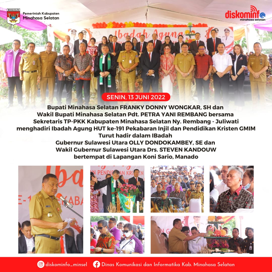Minahasa Selatan, Semartara.News – Bupati Kabupaten Minahasa Selatan (Minsel), Franky Donny Wongkar, S.H bersama Wakil Bupati Pendeta Petra Yani Rembang menghadiri ibadah Agung Hut Pekabaran Injil (PI) dan Pendidikan Kristen (PK GMIM Ke-191 di Tanah Minahasa yang bertempatkan di Lapangan Koni Sario Manado pada senin (13/6/2022).