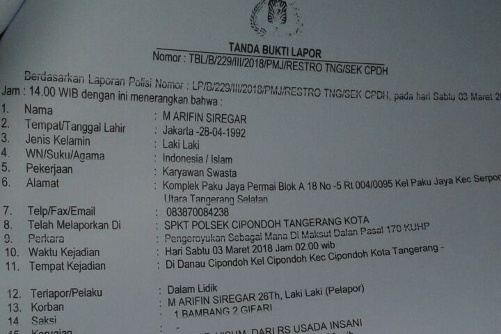 Untuk diketahui, usai kejadian tersebut Arifin langsung melaporkan kejadian tersebut ke Polsek Cipondoh dengan Nomor : TBL/B/229/111/2018/PMJ/RESTO TNG/SEK CPDH sebagai mana dimaksud pasal 170 KUHP.