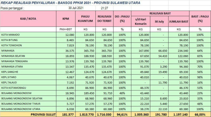 Adapun daerah yang telah 100 persen capaian penyaluran bantuannya yaitu Kota Manado, Kota Bitung, Kota Tomohon, Kabupaten Minahasa Tenggara dan Kabupaten Bolaang Mongondow Utara. (Herald).