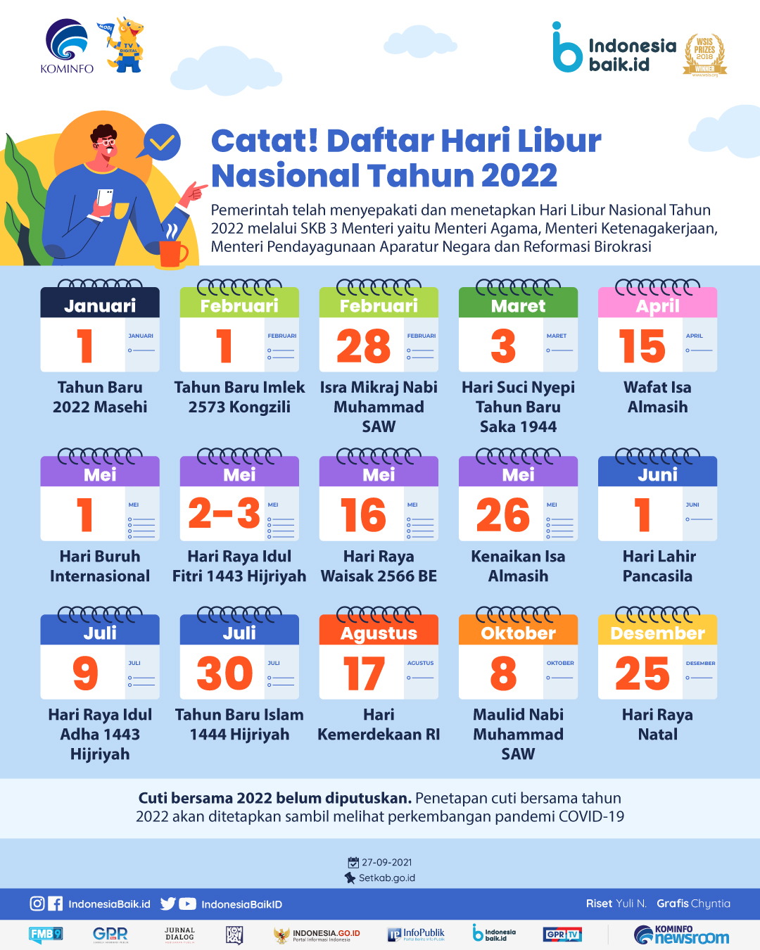 Dimana, Kesepakatan tersebut tertuang dalam Surat Keputusan Bersama dari Menteri Agama, Menteri Ketenagakerjaan, Menteri Pendayagunaan Aparatur Negara dan Reformasi Birokrasi Nomor 963 Tahun 2021, Nomor 3 Tahun 2021, Nomor 4 Tahun 2021 tentang Hari Libur Nasional dan Cuti Bersama Tahun 2022.