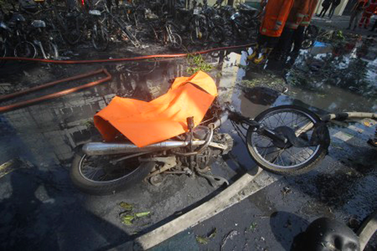 Sejumlah kendaraan sepeda motor rusak terbakar akibat serangan bom di Surabaya. (FOTO ANTARA)