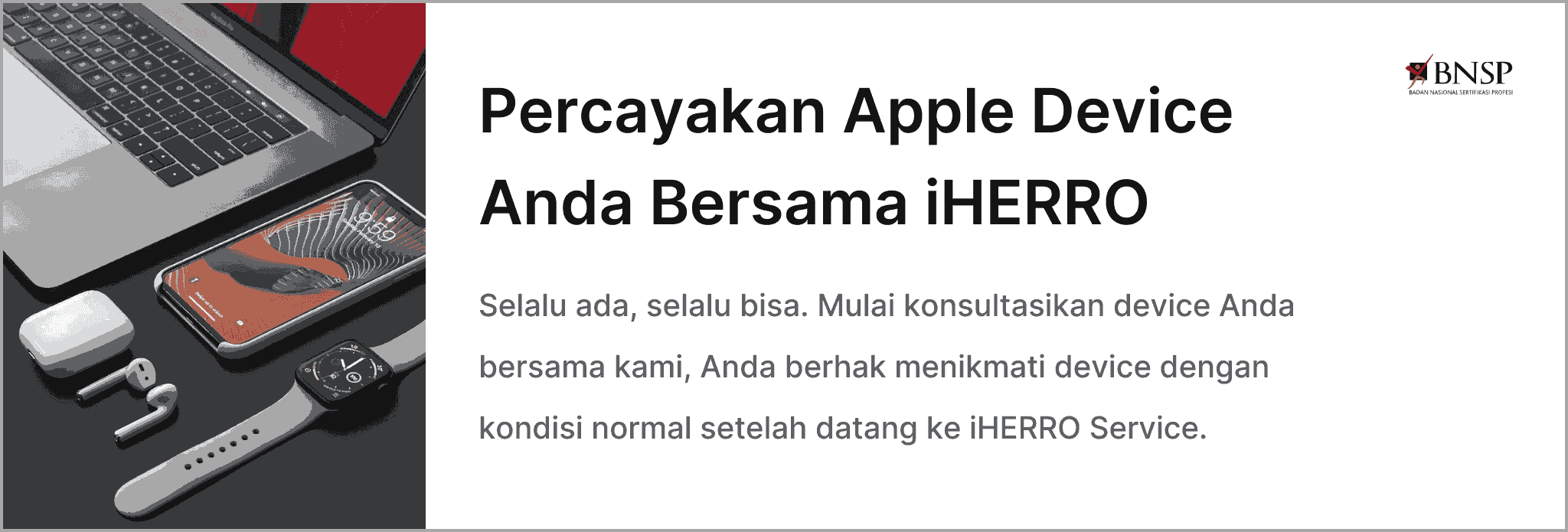 - Teknisi bersertifikat BNSP dengan pengalaman menangani berbagai kerusakan Apple device