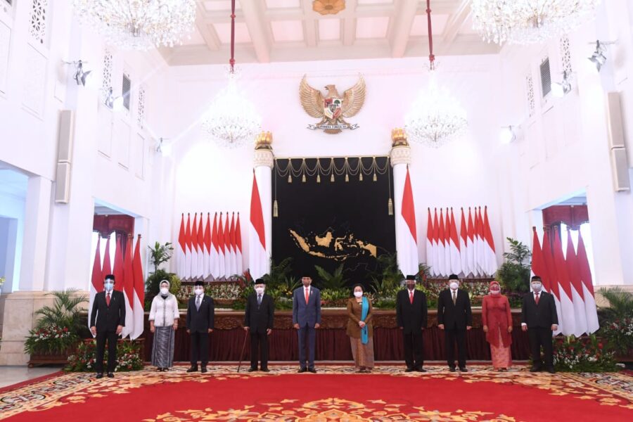 “Saya bersumpah bahwa saya akan setia kepada Undang-Undang Dasar Negara Republik Indonesia Tahun 1945 (UUD 1945), serta akan menjalankan segala peraturan perundang-undangan dengan selurus-lurusnya demi darmabakti saya kepada bangsa dan negara. Bahwa saya dalam menjalankan tugas jabatan akan menjunjung tinggi etika jabatan, bekerja dengan sebaik-baiknya, dengan penuh rasa tanggung jawab,” ujar Presiden mendiktekan penggalan sumpah jabatan kepada nama-nama tersebut.