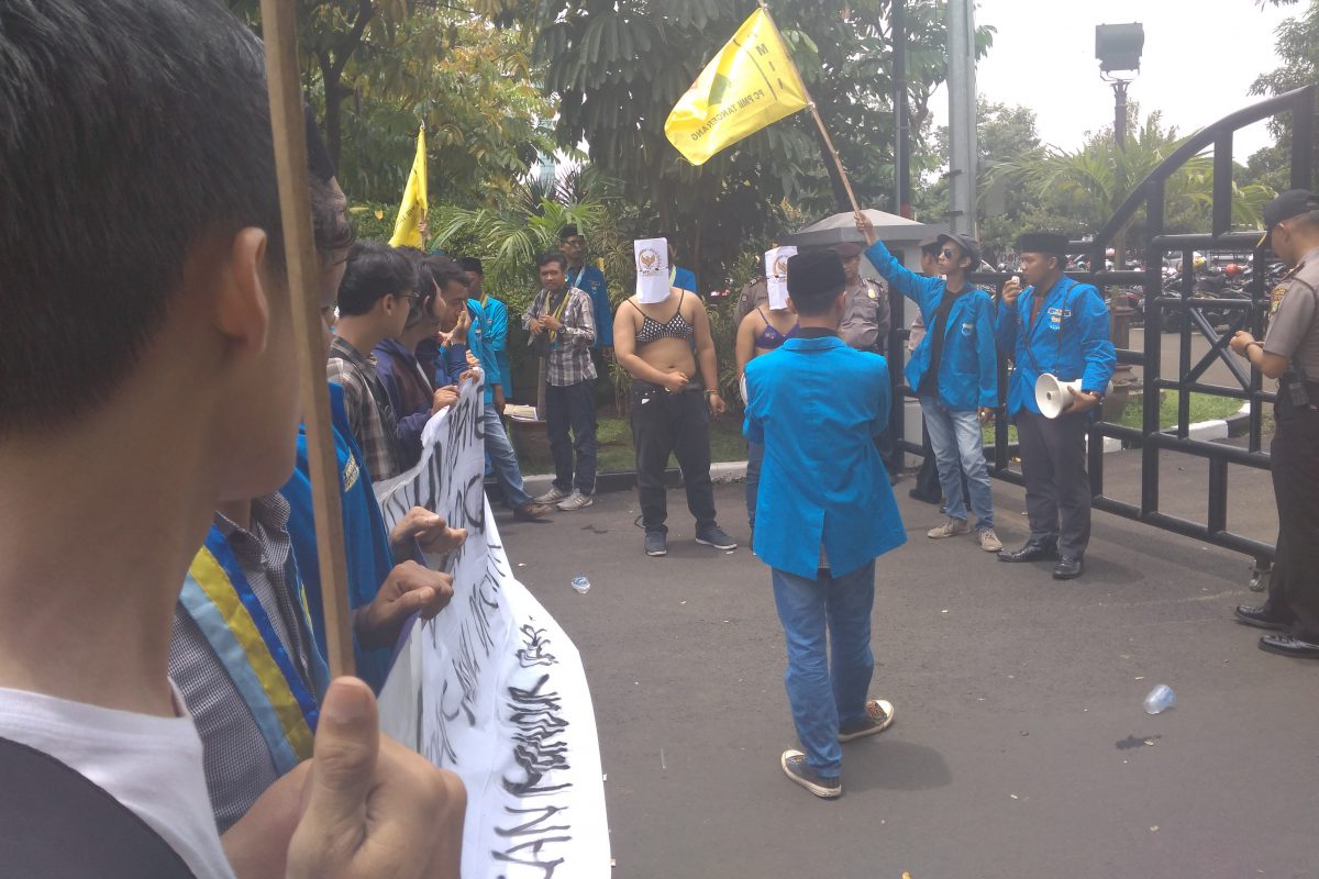 Aksi tersebut diwarnai dua mahasiswa dengan mengenakan bra yang menandai bahwa DPRD Kota Tangerang pengecut dan atau penakut.