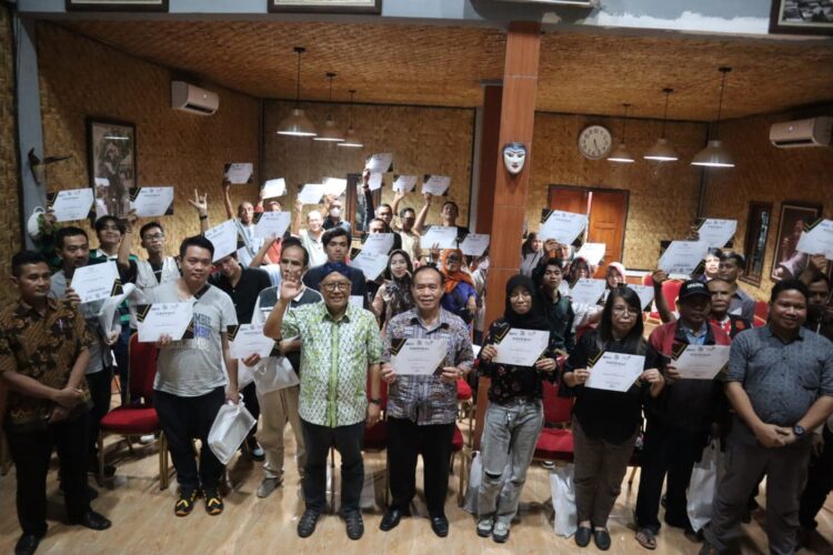 Anggota Komisi VI DPR RI, Ananta Wahana (pakai blangkon) bersama peserta ‘Pelatihan Barista Kopi Untuk Pemula’ di Padepokan Kebangsaan Karang Tumaritis.